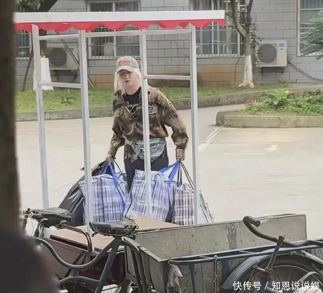 只见她顶着一头炸街的银白色短发,身穿起球的棕色格子衫,背着蛇皮袋在街边拾荒。这身破破烂烂的打扮配上她苍白的妆容,让人很难将她与那个光鲜亮丽的“星二代”联系起来。